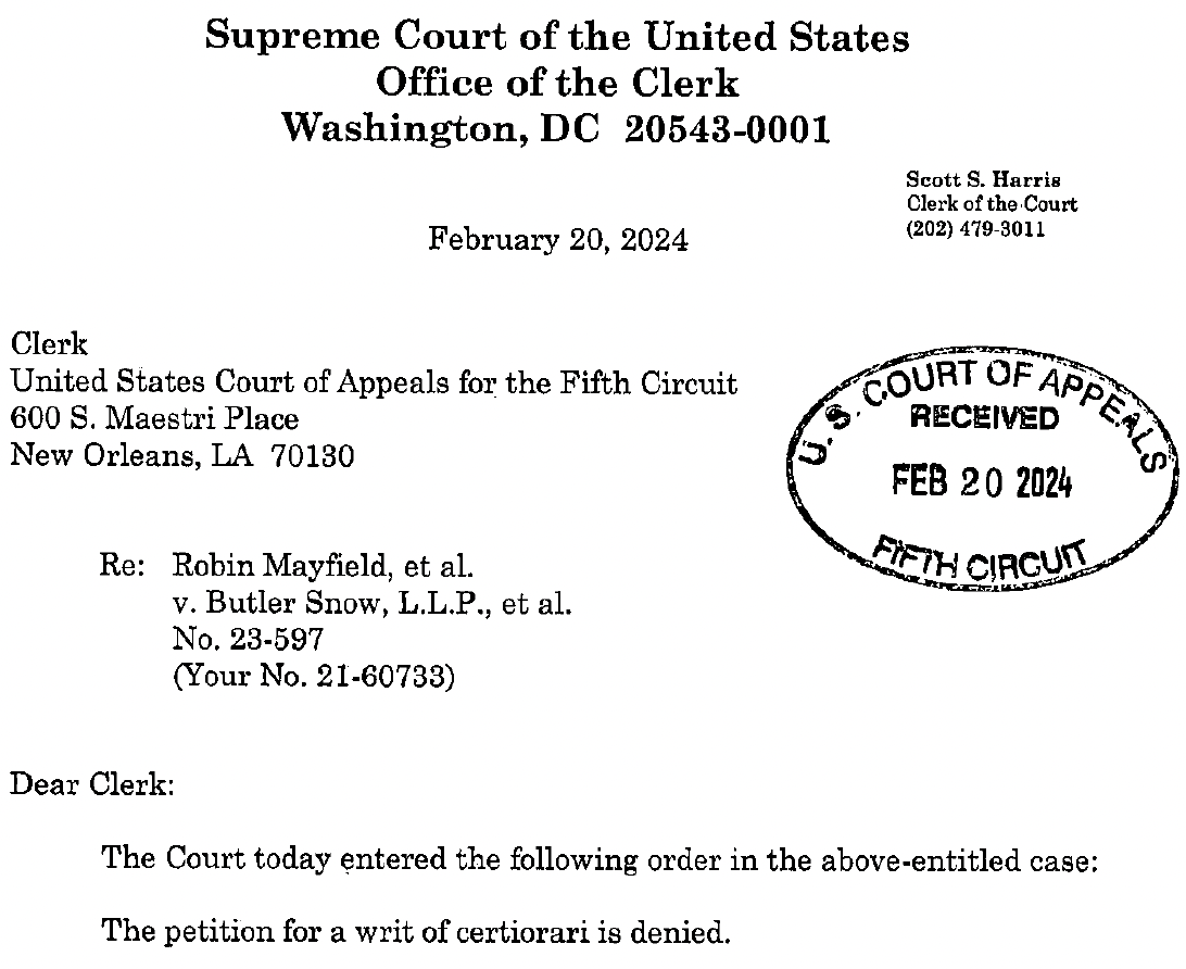 The case dragged on as the two sides waged trench warfare for years. Judge Reeves dismissed Butler Snow and its associated personnel. The Court dismissed the lawsuit against the city of Madison, Investigator Harrison, and Mayor Mary Hawkins-Butler in May 2021 as he granted their motion for summary judgment. Earlier post. He found the Madison police did not arrest Mayfield in retaliation for his support of Chris McDaniel. The Court held: