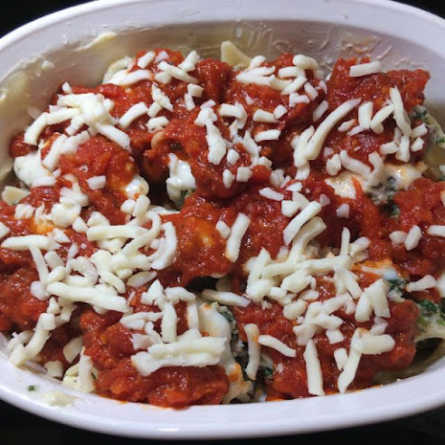 Then béchamel is added over each shell. Then marinara is added over the shells, then Mozzarella cheese, then Parmesan cheese